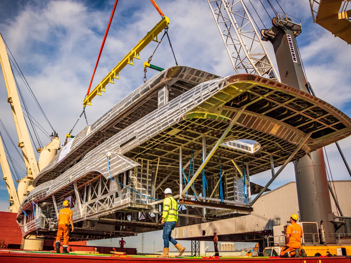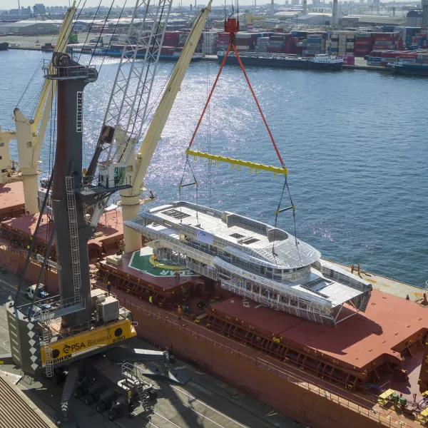 Op maandag 5 september heeft PSA Breakbulk superstructuren voor een superjacht geladen. Het jacht in opbouw bestaat uit 3 delen, waarvan het grootste stuk 37m lang en 10m breed is en maar liefst 40 ton weegt.